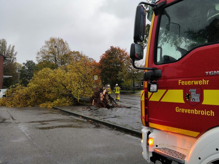 Umgestürzte Bäume, lose Beschilderungen und weitere durch den Wind gelöste Gegenstände versperrten am heutigen Donnerstagmorgen mehrere Grevenbroicher Straßen. Die Feuerwehr musste bis 12 Uhr 23 Einsätze abarbeiten. Dabei wurden die Wehrleute beinahe in allen Stadtteilen tätig. Gegen kurz vor neun wurde Stadtalarm ausgelöst. Alle Gerätehäuser im Stadtgebiet wurden durch die ehrenamtlichen Feuerwehrkräfte besetzt.