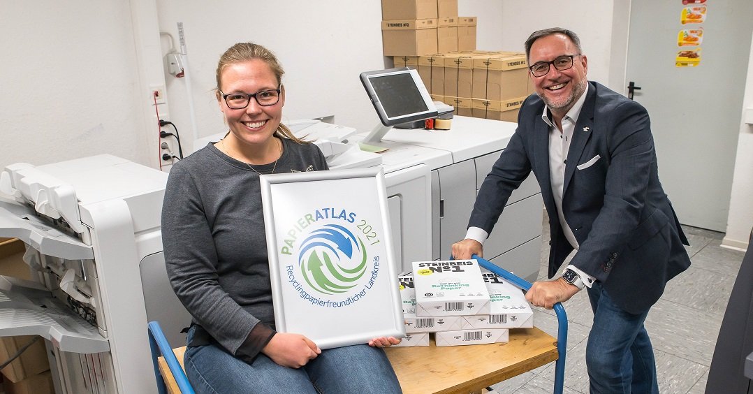 Kreisdezernent Harald Vieten, in dessen Bereich unter anderem die so genannten zentralen Beschaffungen fallen, hat zusammen mit Mitarbeiterin Sarah Peitz die Umstellung auf Recyclingpapier umgesetzt. „In der Verwaltung haben wir jetzt einen Recyclingpapier-Anteil von 100 Prozent erreicht und sind damit ein Best-Practice-Beispiel für nachhaltige Papierbeschaffung“, freut sich Vieten.