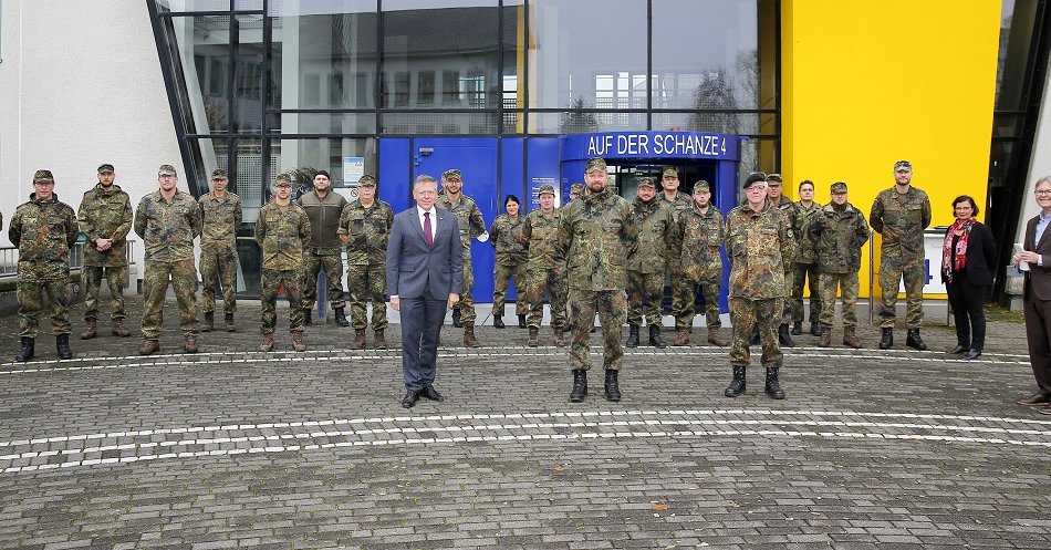 Soldaten der Bundeswehr unterstützen seit kurzem bundesweit wieder in den Gesundheitsämtern. Auch der Rhein-Kreis Neuss setzt auf die engagierten Helfer: Bereits in dieser Woche sind 20 Bundeswehr-Kräfte in Grevenbroich eingetroffen. Der Kreis hatte die Verstärkung angefordert und nach der Bitte um Amtshilfe zur Entlastung des Gesundheitsamtes eine schnelle Zusage erhalten. Landrat Hans-Jürgen Petrauschke, Kreisgesundheitsdezernent Karsten Mankowsky und Amtsleiterin Barbara Albrecht hießen die Frauen und Männer am Kreishaus willkommen.