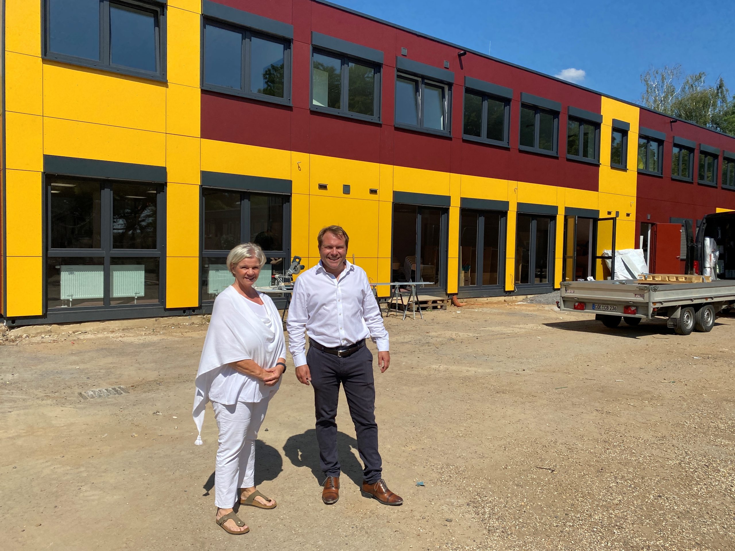 Pünktlich zum Schulbeginn sind die Innenarbeiten im neuen Anbau der Kastanienschule abgeschlossen worden. Auch die Räumlichkeiten des Offenen Ganztags sind fertig und konnten von den Kindern bereits in den vergangenen Tagen genutzt werden. Ganz beendet ist das am 5. April gestartete Neubauprojekt damit noch nicht. Gleichwohl werden die noch ausstehenden Arbeiten im Außenbereich des Neubaus den Unterricht nicht beeinträchtigen. Nach Auskunft von Daniela Parente, Leiterin des Amts für Gebäudewirtschaft, wird die abschließende Gestaltung des Außenbereichs wohl noch mindestens bis zu den Herbstferien dauern. Bürgermeister Dr. Martin Mertens überzeugte sich jetzt kurz vor dem Start des neuen Schuljahrs aus eigenem Augenschein vom aktuellen Status Quo. „Ich bin sehr zufrieden, dass der Neubau bezugsfertig ist und zukünftig vielen Kindern Platz bieten wird. Ich wünsche allen, insbesondere natürlich den Erstklässlern, einen guten Start“, sagte der Rathauschef bei einem Treffen mit Schulleiterin Annette Gruner. Durch den Anbau sind 15 neue Räume entstanden, drei werden als reine Klassenräume dienen. Unter dem Strich kostet der Anbau der „neuen“ Kastanienschule 3,5 Millionen Euro.