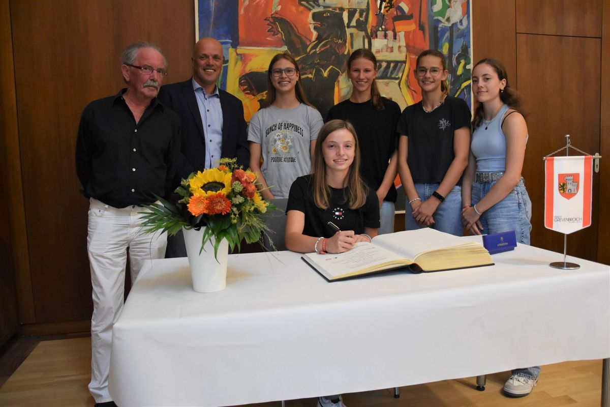 Zu Beginn der Ratssitzung am 01.09.2022 stand ein besonderer Punkt auf der Tagesordnung: Die Gewinnerin der Goldmedaille über 80 Meter Hürden der Deutschen Leichtathletik-Meisterschaften der Altersklasse U16, Lilli Schlößer, trug sich in das Goldene Buch der Stadt Grevenbroich ein.