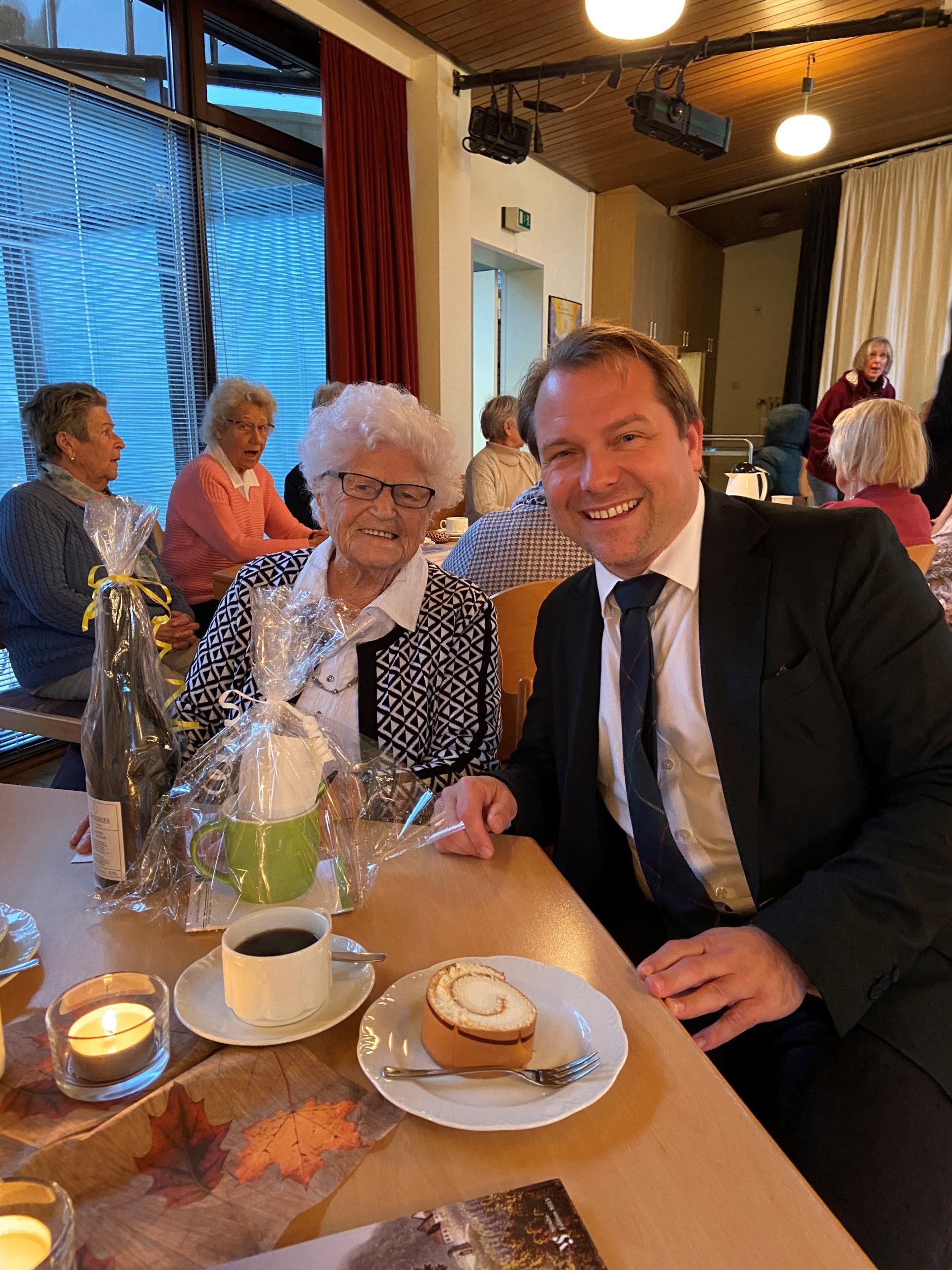 Vielleicht klappt es ja in diesem Jahr: Hatten sich Bürgermeister Dr. Martin Mertens und Lieselotte Fueller anlässlich ihres 100.Geburtstags 2021 zu einem Glühwein auf dem Weihnachtsmarkt verabredet, musste der damals wegen Corona wie schon 2020 ausfallen. Anlässlich des 101. Geburtstags der inzwischen ältesten Einwohnerin der Gemeinde wurde die Verabredung nun für den dritten Advent, 11. Dezember, erneuert, wenn der Weihnachtsmarkt erstmals auf dem neuen Festgelände an der B 59 stattfinden wird. Im Gemeindesaal der evangelischen Kirche am Grünweg wurde der denkwürdige Geburtstag jetzt auch innerhalb des Seniorenkreises der Kirche gefeiert, wobei natürlich auch Pfarrer Thorben Golly zu den allerersten Gratulanten gehörte. Seit mittlerweile 25 Jahren lebt die gebürtige Frankfurterin Lieselotte Fueller inzwischen in Vanikum – wohin sie ursprünglich gekommen war, um ihre Mutter zu pflegen, die 101 Jahre wurde. „Als sehr ländlich“, empfand sie die Gemeinde in den 1990-er Jahren aus der Perspektive der Großstädterin, was für sie durchaus auch heute noch gilt, wenngleich Lieselotte Fueller das Wachstum der Gemeinde von damals etwa 12.000 auf ak-tuell über 14.000 Einwohner sehr wohl registriert hat.