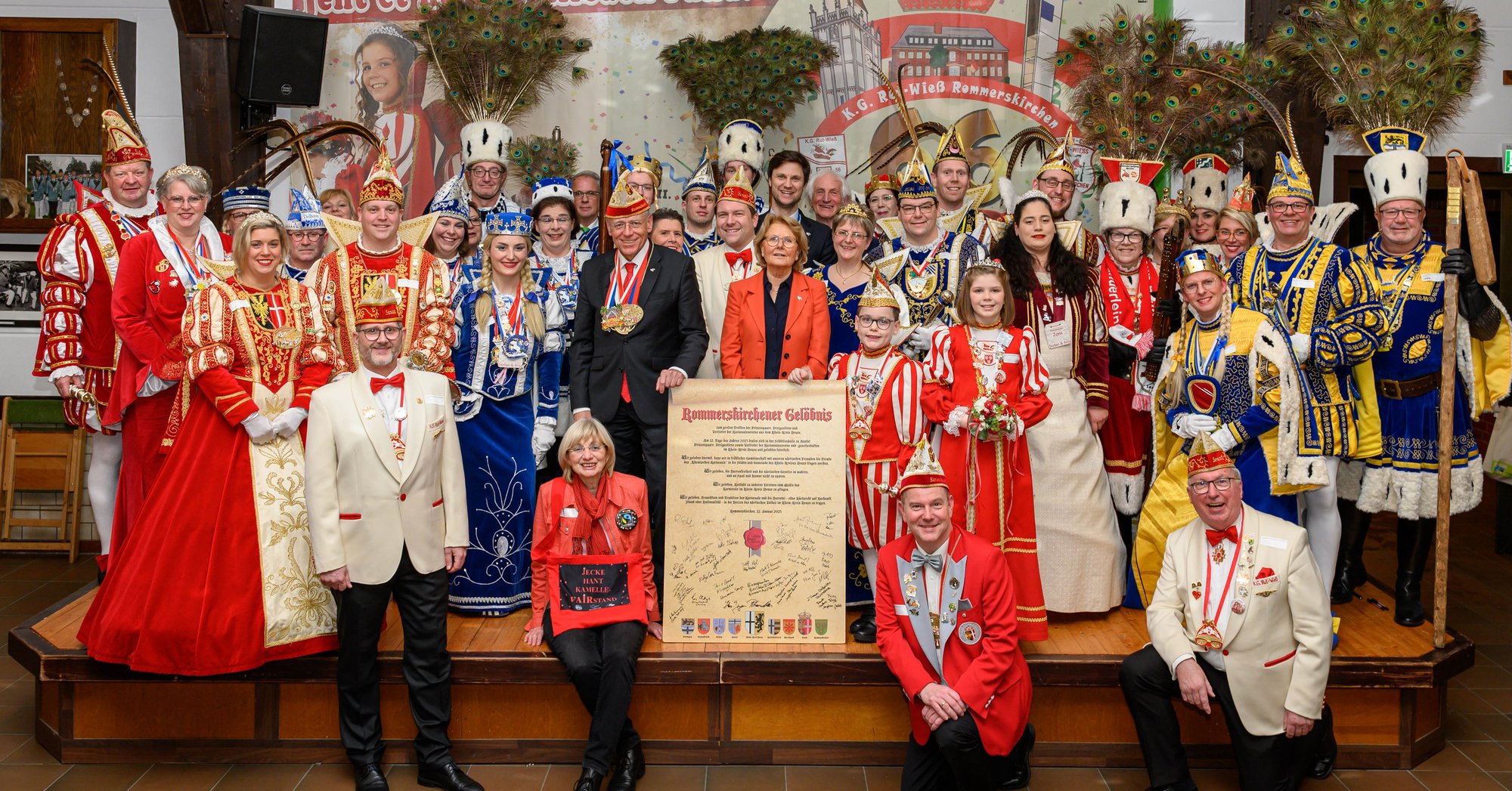 In vollem Ornat gaben die versammelten Tollitäten nicht nur ein prächtiges Bild ab, sie unterzeichneten mit Petrauschke, Mertens und den Vereinsvorständen auch das „Rommerskirchener Gelöbnis“ – eine Erklärung, gut gelaunt die jecke Zeit im Rhein-Kreis Neuss zu pflegen. „Wir geloben, dass wir in fröhlicher Gemeinschaft mit unseren närrischen Freunden die Freude des rheinischen Karnevals in die Städte und Dörfer tragen werden. Wir geloben, die Narrenfreiheit und die närrischen Gesetze zu wahren und an Frohsinn nicht zu sparen“, so heißt es darin. Außerdem gelobten die Unterzeichner, Kontakte zu anderen Vereinen zum Wohl des Karnevals zu pflegen und das Winterbrauchtum in die Herzen des närrischen Volks zu tragen.