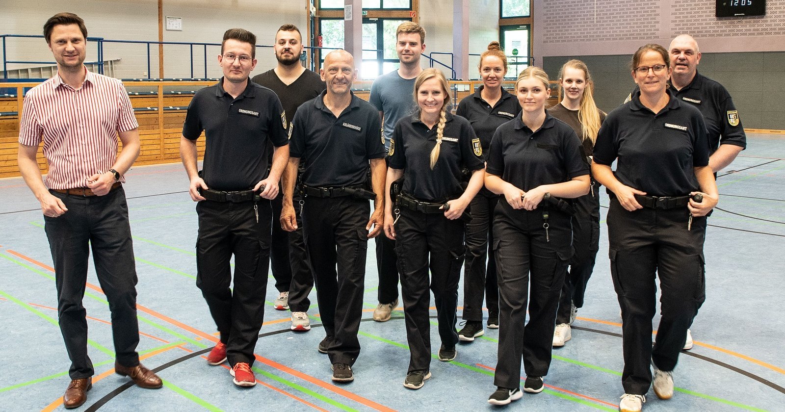 Vor Ort machte sich auch Kreisdezernent Martin Stiller ein Bild von den Trainingsinhalten. „Ziel ist es, dass unsere Mitarbeiterinnen und Mitarbeiter bestmöglich auf Situationen, die im Einsatzalltag auftreten können, vorbereitet sind, um sicher zu agieren und auch in brenzligen Situationen unverletzt zu bleiben“, betont er. „In den Trainings werden daher auch bereits angeeignete Techniken und Inhalte bewusst wiederholt. Die stetige Wiederholung der Techniken ist notwendig, um das Erlernte in einer Einsatzsituation unter Stress abrufen zu können.“