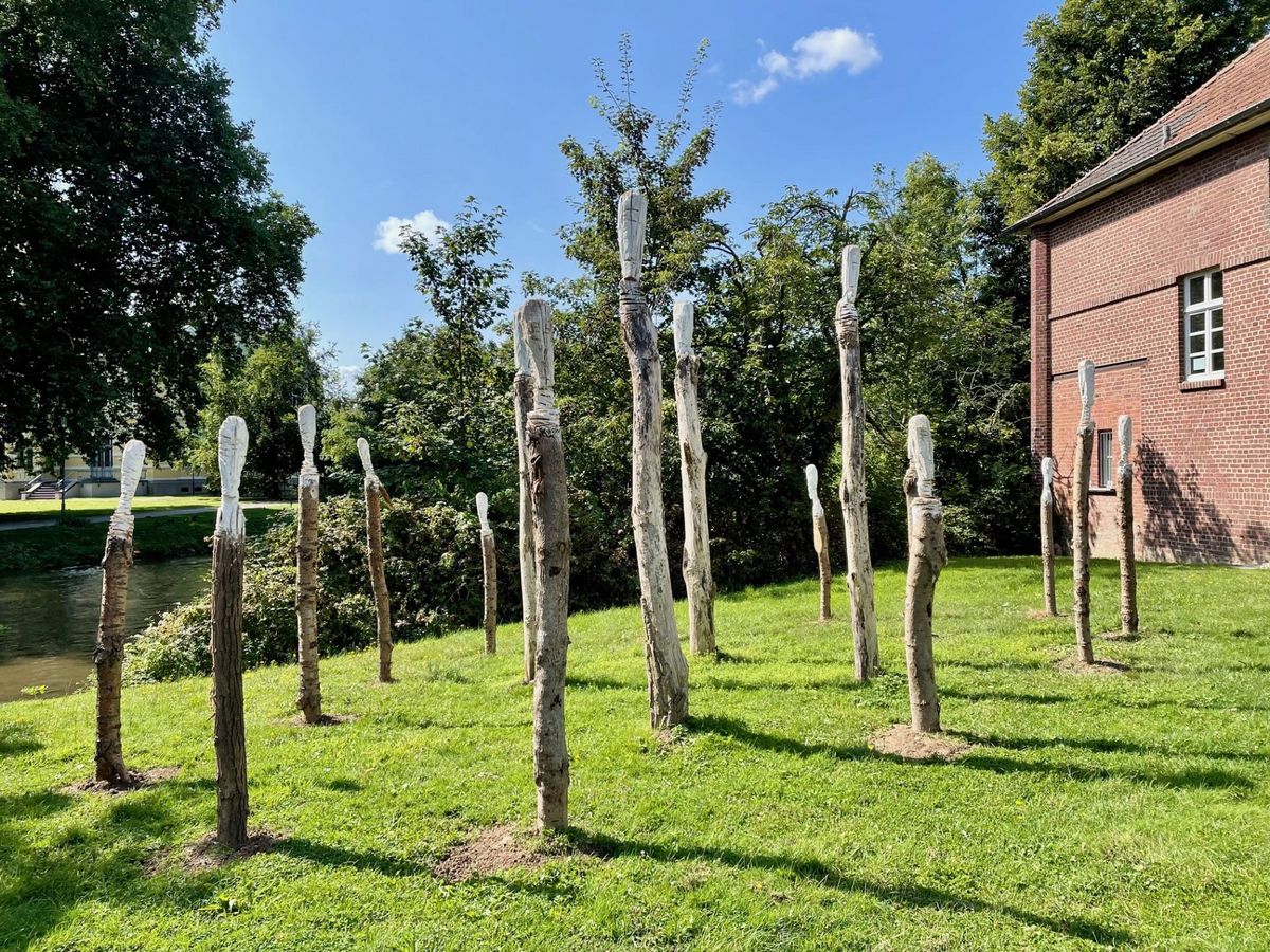 Die Kunstinstallation der vier Pappelmänner auf der Stadtparkinsel wurde jetzt um zwölf Skulpturen des renommierten Künstlers Matthias Hintz erweitert. Damit werden die vier verbliebenen älteren Stelen ergänzt und ein beeindruckendes Ensemble aus insgesamt 16 Skulpturen geschaffen, das nun das Erftufer schmückt.