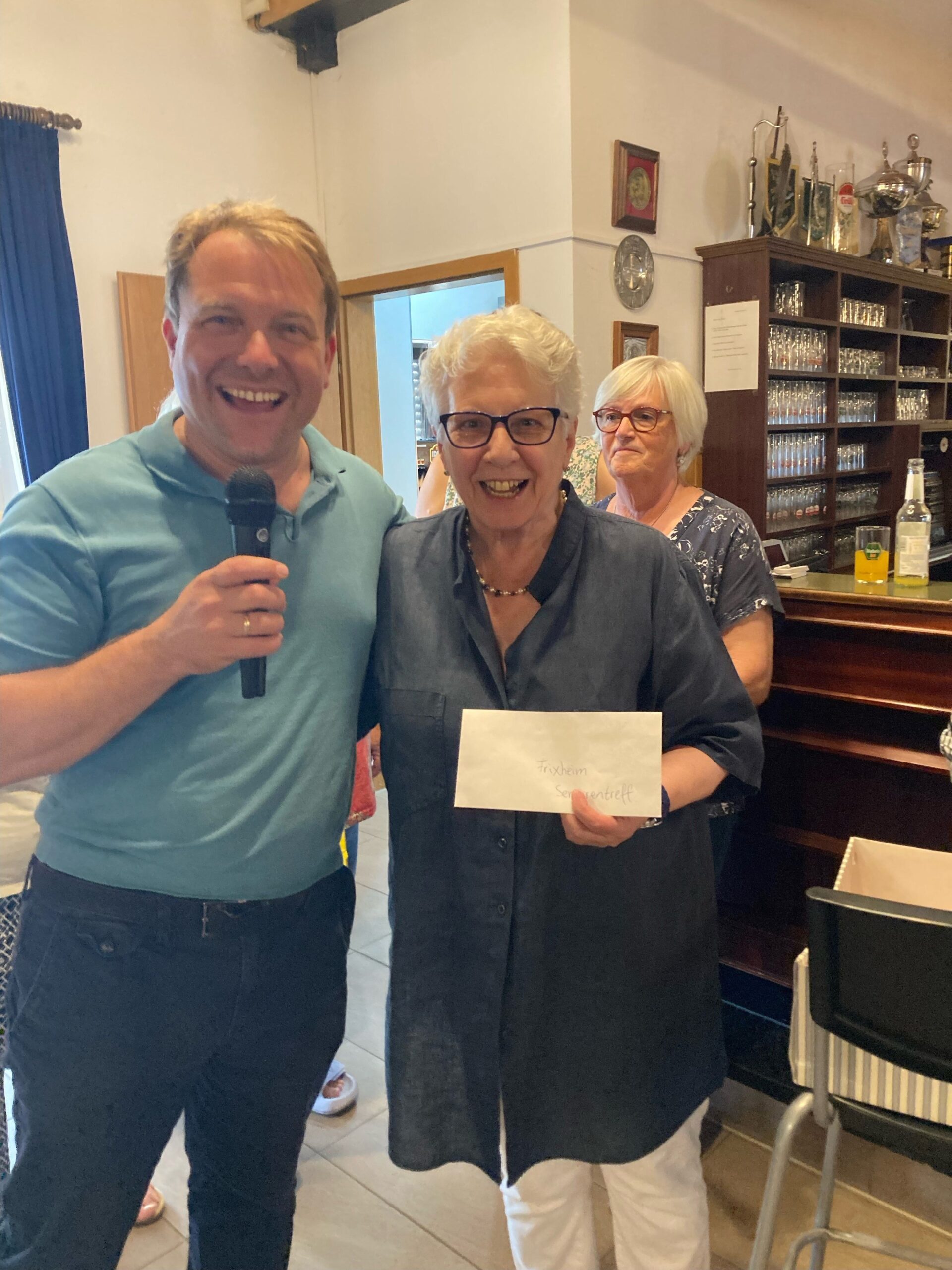 Martin Mertens überreichte jetzt im Frixheimer Schützenhaus einen entsprechenden Scheck an Gaby Schlömer, die mit ihrem Team der St. Sebastianus-Bruderschaft seit mehr als zwei Jahrzehnten den Seniorentreff organisiert und für eine stets reichlich gedeckte Kaffeetafel sorgt.