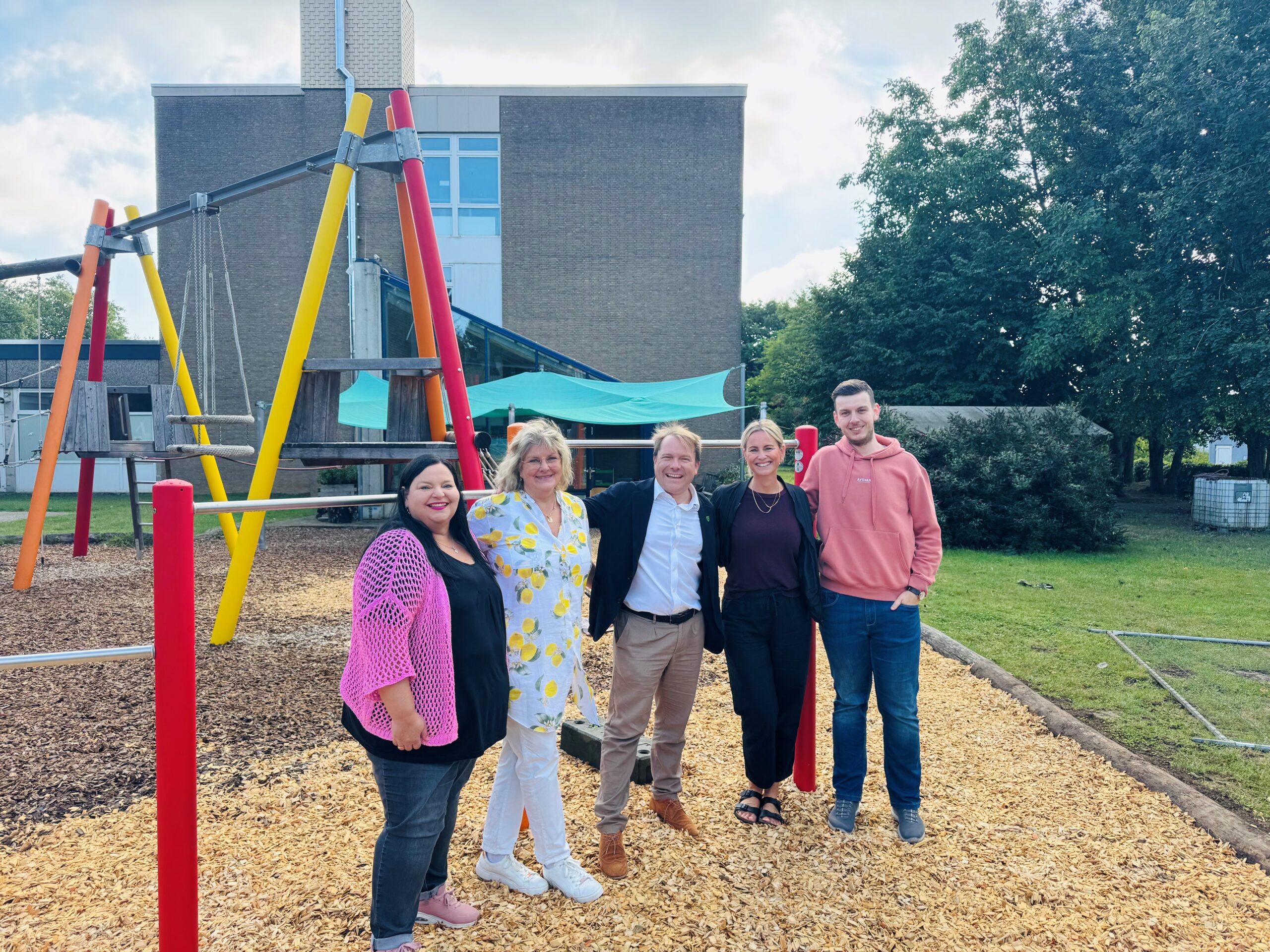 Heute konnte der Bürgermeister das neue Spielgerät gemeinsam mit der Leiterin des Familienbüros, Monika Lange, und dem stellv. Leiter, Henrik Peters an die Schulleiterin Bärbel Zippenfennig und der OGS-Leiterin, Lioba Stemmler, übergeben.
