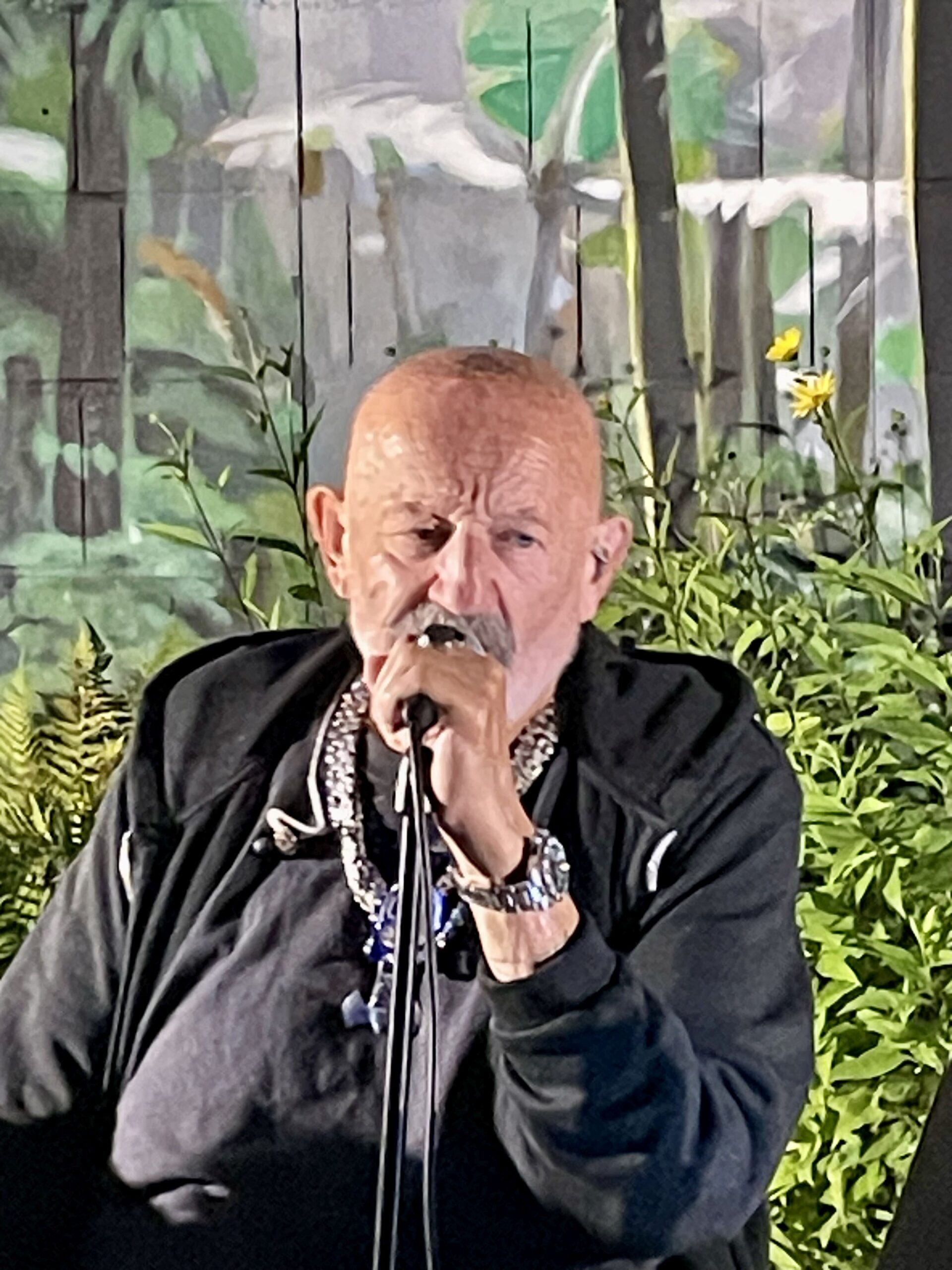 Was sich indes schlagartig änderte, als das am Ende gut zweistündige Garten-Konzert seinen Lauf nahm. Auch wenn er heutzutage nicht mehr im Tigerfell-Kostüm über die Bühne fegt, die Stimme ist vollends intakt, und so blühte Jürgen Zeltinger regelrecht auf, als es darum ging, seine längst zu Klassikern gewordenen Hits zu präsentieren – und zwischendurch auch über deren Hintergründe zu paludern: „Mallorca, Sommer, Sonne Herzinfarkt“ etwa entstand nach einem gründlich schief gelaufenen Besuch der Insel: Eigentlich sollte es dort ins Tonstudio gehen, wo Jürgen Zeltinger und seine Band es jedoch gerade mal auf ein einziges Lied brachten, weil zuvor irgendwie der Alkohol dazwischen gekommen war und er selbst drei Tage lang die Intensivstation nicht verlassen konnte.