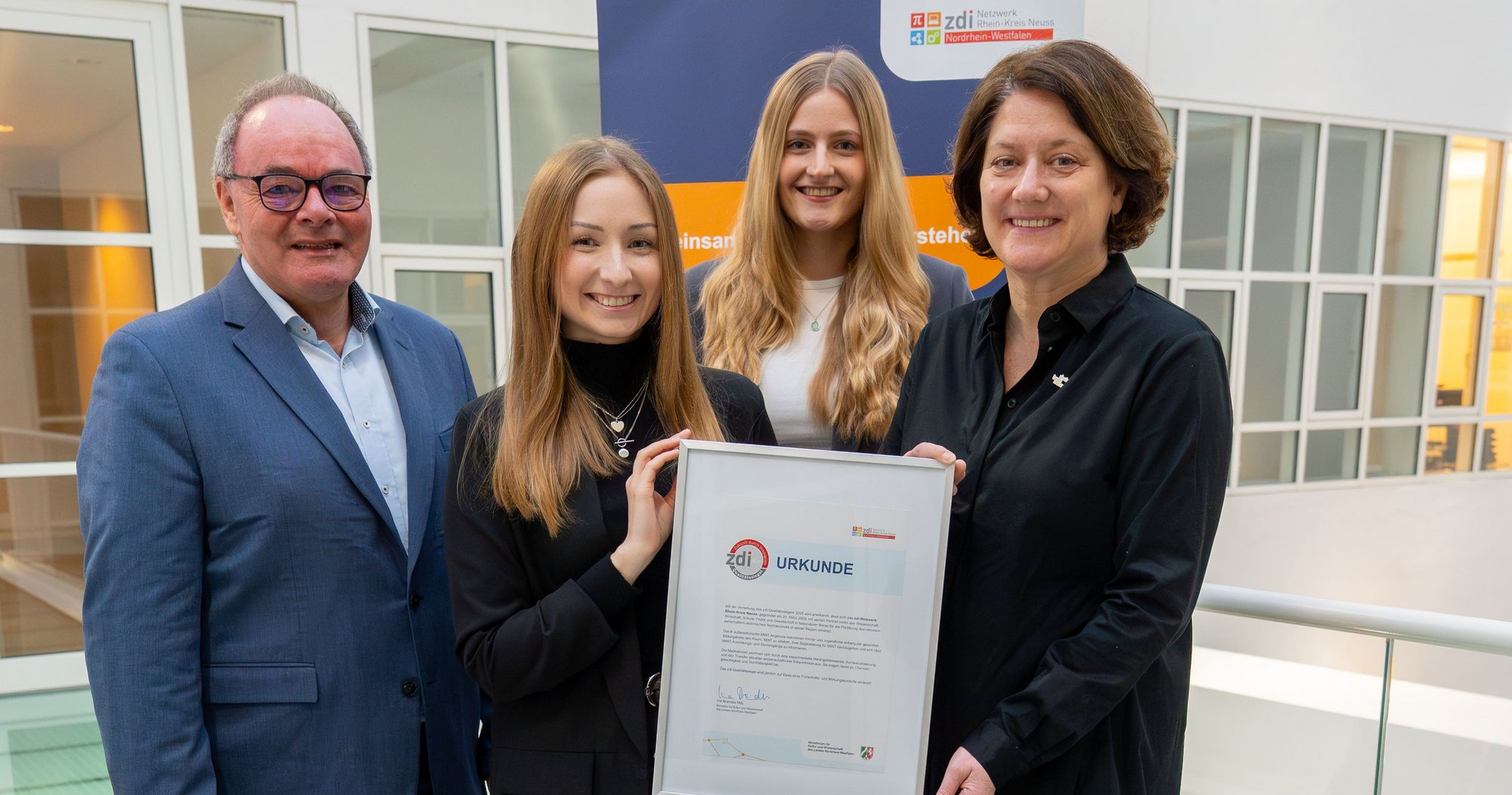 Das zdi-Netzwerk Rhein-Kreis Neuss ist erneut mit dem zdi-Qualitätssiegel ausgezeichnet worden. Verliehen wird das Qualitätssiegel jährlich vom Ministerium für Kultur und Wissenschaft des Landes Nordrhein-Westfalen an zdi-Netzwerke, die vereinbarte Qualitätskriterien erfüllen. Das Kürzel „zdi“ steht für „Zukunft durch Innovation“. Dabei handelt es sich um eine Gemeinschaftsoffensive zur Förderung des naturwissenschaftlich-technischen Nachwuchses in Nordrhein-Westfalen.