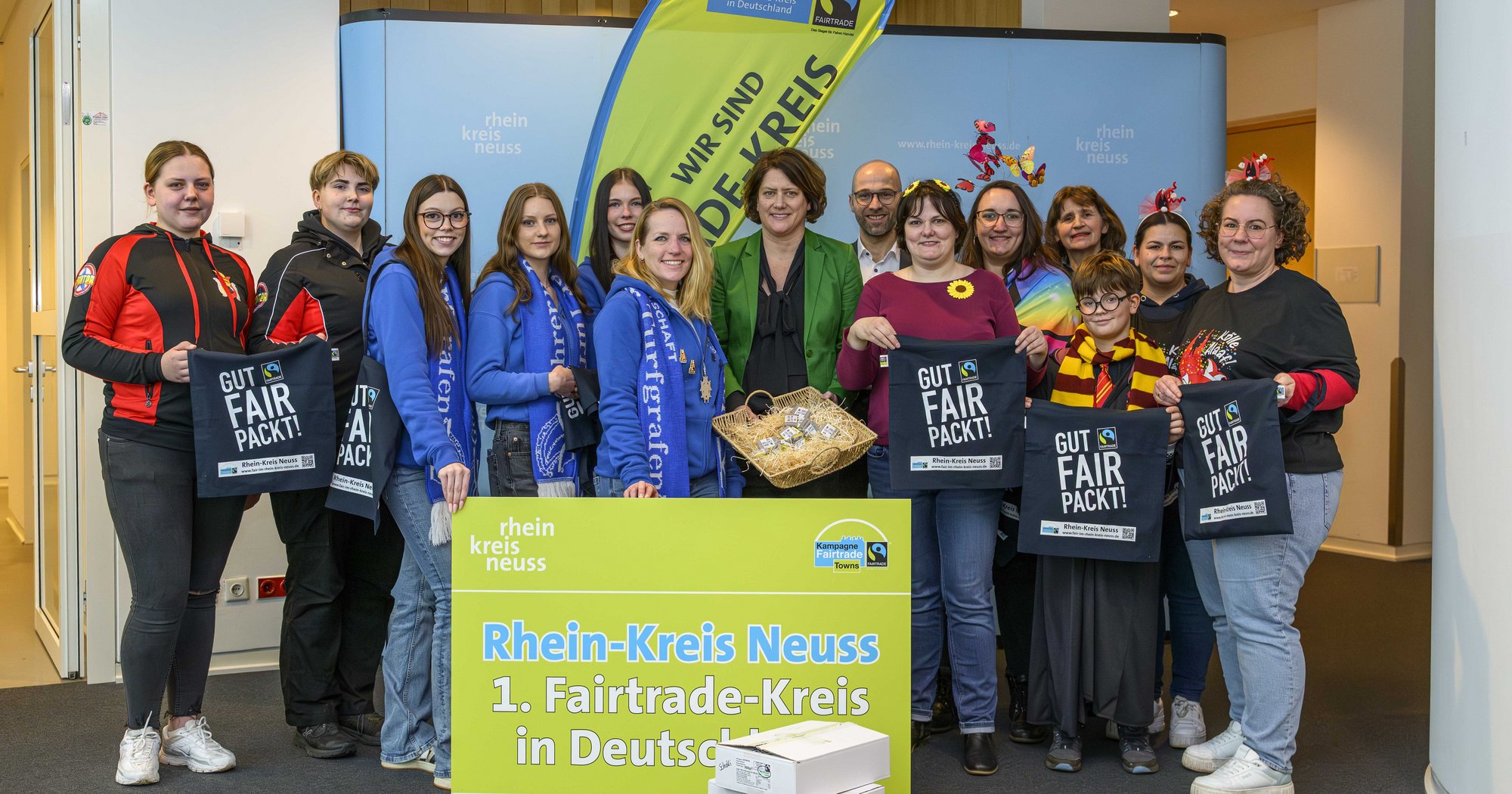 Faire Kamelle regnet es bei den Karnevalsumzügen in Neuss, Dormagen-Gohr und Grevenbroich-Gustorf. Jeweils 400 fair gehandelte Schokotäfelchen gingen beim Social Media-Gewinnspiel des Rhein-Kreises Neuss an drei Karnevalsvereine und -gruppen im Kreis. Landrätin Katharina Reinhold betonte bei der Übergabe: „Mit dieser Aktion unterstützen wir als Fairtrade-Kreis die Karnevalisten im Kreis, damit sie einen Teil des herkömmlichen Wurfmaterials durch faire Kamelle ersetzen können.“